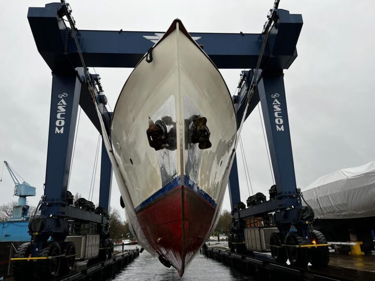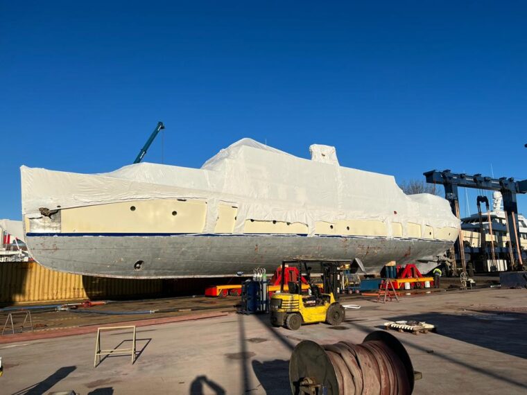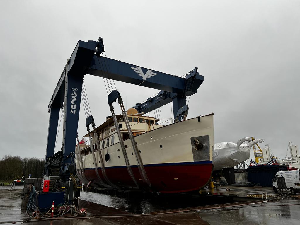 AYS was delighted to be tasked with carrying out works on this classic Camper & Nicholsons motor yacht to help restore her to her glory days. The vessel underwent a haul-out and a full hydro-jet blast of her underwater hull to remove her silicon-based antifoul. We then placed Fair Lady on a barge for transportation to Royal Huisman, where her works continued at the Huisfit facility.